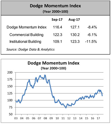 NEW YORK – October 6, 2017 – The Dodge Momentum Index fell in September, moving 8.4% lower to 116.4 (2000=100) from the revised August reading of 127.1. The Momentum Index is a monthly measure of the first (or initial) report for nonresidential building projects in planning, which have been shown to lead construction spending for nonresidential buildings by a full year. Both components of the Momentum Index declined in September. The institutional building component fell 11.5% from August, while the commercial building component fell 6.1%. While the overall Momentum Index has lost ground for four consecutive months, this should not be seen, in and of itself, as a predictor of a turn in building markets. Prior to the previous peak of the Momentum Index in January 2008 it had suffered similar significant declines, only to rebound and post strong gains in subsequent months in line with overall economic growth. Similarly, the Momentum Index posted healthy gains from late-2016 through early 2017. Economic growth remains solid, and building market fundamentals are supportive of further growth in construction activity.
